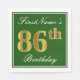 Cette conception simple et élégante de serviette en papier comporte un message comme "86e anniversaire de FirstName" (le "86e" ayant une fausse couleur dorée) dans une zone carré de couleur verte avec un contour de bordure simple. Le nom est dans un texte de type script de couleur blanche, et peut être personnalisé. Des serviettes comme celles-ci pourraient peut-être être utilisées à une fête d'anniversaire pour quelqu'un qui célèbre son quatre-vingt-sixième anniversaire. [~Z0000137]