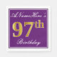Cette conception simple et élégante de serviette en papier comporte un message comme "97e anniversaire de ANameHere" (avec la "97e" avec une fausse couleur dorée) dans une zone carré de couleur violette avec un contour de bordure simple. Le nom est dans un texte de type script de couleur blanche, et peut être personnalisé. Des serviettes comme celles-ci pourraient peut-être être utilisées à une fête d'anniversaire pour quelqu'un qui célèbre son quatre-vingt-dix-septième anniversaire. [~Z0000140]