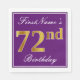 Cette conception simple et élégante de serviette en papier comporte un message comme "72e anniversaire de FirstName" (le "72e" ayant une fausse couleur dorée) dans une zone carré de couleur violette avec un contour de bordure simple. Le nom est dans un texte de type script de couleur blanche, et peut être personnalisé. Des serviettes comme celles-ci pourraient peut-être être utilisées à une fête d'anniversaire pour quelqu'un qui célèbre son soixante-douzième anniversaire. [~Z0000140]