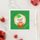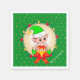 Un elfe de Noël mignon tenant une boîte cadeau au centre d'une couronne de pin ornée de boules dorées et rouges entourée d'étoiles sur le papier de Noël vert Napkin. Le texte peut être personnalisé. Passez un merveilleux Noël !
