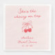 Serviettes pour douche de mariage de style rétro rouge et rose avec une illustration dessinée à la main d'une paire de cerises surmontées d'un nœud coquet et le titre "Elle est la cerise sur le gâteau" dans une police manuscrite. Personnalisez avec le nom de la future mariée et la date de la douche.
