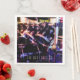 L'oeuvre de ces serviettes en papier est une photographie originale d'un ensemble de tambours. Les tambours noirs brillants avec leurs jantes argentées reflètent les couleurs des lumières du studio, blues, rouges et verts. Des cymbales au-dessus des tambours attendent d'être frappées. Il y a un texte facultatif qui dit "Le Beat continue". Ceci est configuré pour que vous personnalisiez ou supprimiez si vous le souhaitez.