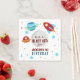 Thème d'anniversaire de l'espace pour les enfants. Facile à personnaliser. Aussi disponible en tant qu'invitation à télécharger en ligne! Printemps, fêtes estivales vaisseau spatial, planètes, lune, étoiles, vaisseau spatial alien, police de script amusant
