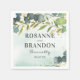 Serviettes de mariée vertes et poussiéreuses avec un lavement à l'aquarelle vert/bleu, feuilles d'eucalyptus botaniques enchanteurs, éclaboussures de fausse feuille d'or, le nom du couple et la date du mariage.