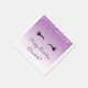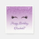 Serviettes en papier au design design design et tendance. L'arrière - plan est un dégradé violet avec une image de parties scintillant faux scintillant qui descend du haut. Une paire de cils mignons ceinturés sous l'image de la parties scintillant. Ajoutez votre propre texte personnalisé.