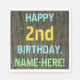 Ce design amusant de serviette de fête d'anniversaire comporte un message comme "HAPPY 2nd BIRTHDAY, NAME-HERE !", où le nom peut être personnalisé. L'arrière - plan présente un motif rustique, brun, imitation bois de grain. Le texte du message personnalisé présente des couleurs comme le bleu, le jaune et le vert, et il a un aspect inspiré de celui du lettrage peint et recouvert de pochoirs. Des serviettes comme celles-ci pourraient être utilisées à une fête d'anniversaire pour quelqu'un qui célèbre son deuxième anniversaire. [~Z0000292]