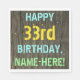 Ce design amusant de serviette de fête d'anniversaire comporte un message comme "HAPPY 33rd BIRTHDAY, NAME-HERE!", où le nom peut être personnalisé. L'arrière - plan présente un motif rustique, brun, imitation bois de grain. Le texte du message personnalisé présente des couleurs comme le bleu, le jaune et le vert, et il a un aspect inspiré de celui du lettrage peint et recouvert de pochoirs. Des serviettes comme celles-ci pourraient peut-être être utilisées à une fête d'anniversaire pour quelqu'un qui célèbre son trente-troisième anniversaire. [~Z0000292]