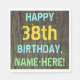 Ce design amusant de serviette de fête d'anniversaire comporte un message comme "HAPPY 38th BIRTHDAY, NAME-HERE!", où le nom peut être personnalisé. L'arrière - plan présente un motif rustique, brun, imitation bois de grain. Le texte du message personnalisé présente des couleurs comme le bleu, le jaune et le vert, et il a un aspect inspiré de celui du lettrage peint et recouvert de pochoirs. Des serviettes comme celles-ci pourraient être utilisées à une fête d'anniversaire pour quelqu'un qui célèbre son trente-huitième anniversaire. [~Z0000292]