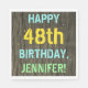 Ce design amusant de serviette de fête d'anniversaire comporte un message comme "HAPPY 48th BIRTHDAY, JENNIFER!", où le nom peut être personnalisé. L'arrière - plan présente un motif rustique, brun, imitation bois de grain. Le texte du message personnalisé présente des couleurs comme le bleu, le jaune et le vert, et il a un aspect inspiré de celui du lettrage peint et recouvert de pochoirs. Des serviettes comme celles-ci pourraient être utilisées à une fête d'anniversaire pour quelqu'un qui célèbre son quarante-huitième anniversaire. [~Z0000292]