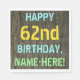 Ce design amusant de serviette de fête d'anniversaire comporte un message comme "HAPPY 62nd BIRTHDAY, NAME-HERE!", où le nom peut être personnalisé. L'arrière - plan présente un motif rustique, brun, imitation bois de grain. Le texte du message personnalisable est composé de couleurs comme le bleu, le jaune et le vert, et il a un aspect inspiré de celui du lettrage peint et recouvert de pochoirs. Des serviettes comme celles-ci pourraient être utilisées à une fête d'anniversaire pour quelqu'un qui célèbre son soixante-deuxième anniversaire. [~Z0000292]