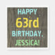 Ce design amusant de serviette de fête d'anniversaire comporte un message comme "HAPPY 63rd BIRTHDAY, JESSICA!", où le nom peut être personnalisé. L'arrière - plan présente un motif rustique, brun, imitation bois de grain. Le texte du message personnalisable est composé de couleurs comme le bleu, le jaune et le vert, et il a un aspect inspiré de celui du lettrage peint et recouvert de pochoirs. Des serviettes comme celles-ci pourraient être utilisées à une fête d'anniversaire pour quelqu'un qui célèbre son soixante-troisième anniversaire. [~Z0000292]