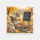 Une charmante scène représente un écureuil dans un petit tablier, assis à côté d'une caisse en bois débordant de noix et de baies, tandis qu'un tableau à proximité montre les prix des noix, créant une atmosphère de marché capricieuse