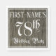 Ce design luxueux et soigné de serviette en papier à thème d'anniversaire comporte un nom modifiable et le message "78th Birthday Party". Le grand numéro "78th" et les mots "Birthday Party" sont dans un texte élaboré de style script, et l'arrière - plan présente une imitation/faux motif d'inspiration boisée. Des serviettes en papier aussi élaborées et bien décorées pourraient être utiles lors d’une fête d’anniversaire organisée pour célébrer le 78e anniversaire de quelqu’un. [~Z0000564]