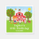 Cette serviette mignonne et amusante présente une fille aux cheveux roux avec une peau claire à côté d'une grange rouge avec une girouette coq. Il y a des animaux de ferme adorables tels qu'une vache, un cochon et une poule. En arrière-plan, on voit un ciel bleu vif, des pommiers, du soleil, des papillons et des marguerites. Le texte combine des polices grasses et sans empattement pour un look élégant et moderne. C'est parfait pour une fête d'anniversaire sur le thème de la ferme.