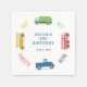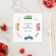 La serviette papier de la fête d'anniversaire du thème du transport comprend un camion bleu, un camion à ordures, un autobus scolaire et un camion d'incendie.