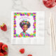 Jolie petite fille de couleur avec des fleurs jaunes, violettes et roses dans ses cheveux. Ajoutez un nom dans la zone personnalisée. Serviettes en papier fête d'anniversaire.