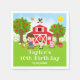 Cette serviette mignonne et amusante présente un garçon aux cheveux bruns avec une peau claire à côté d'une grange rouge avec une girouette coq. Il y a des animaux de ferme adorables tels qu'une vache, un cochon et une poule. En arrière-plan, on voit un ciel bleu vif, des pommiers, du soleil, des papillons et des marguerites. Le texte combine des polices grasses et sans empattement pour un look élégant et moderne. C'est parfait pour une fête d'anniversaire sur le thème de la ferme.