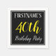Cette conception simple et élégante de serviette en papier comporte un message comme "la fête du 40e anniversaire du prénom", avec le "40e" en texte jaune raffiné, dans une zone carré de couleur noire avec un contour de bordure simple. Un nom personnalisé peut être utilisé. Des serviettes comme celles-ci pourraient être utilisées à une fête d'anniversaire pour quelqu'un qui célèbre son quarantième anniversaire. [~Z0000150]