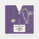 Des serviettes de fête de remise de diplômes créatives avec des gommages d'hôpital violets, un stéthoscope et un couteau de l'armée suisse. Modifier le texte pour ajouter le nom du médecin, de l'infirmière ou de l'assistant médical.