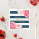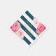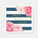 serviettes de Fête des mariées en rayures bleu marine et blanc avec aquarelle rose fleurs vintages et texte couleur or.