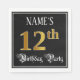 Cette serviette en papier ornée et opulente à thème d'anniversaire comporte un nom personnalisé et le message "12e anniversaire fête". Le grand numéro "12ème" a un motif de coloriage imitation/faux d'inspiration or, et les mots "fête d'anniversaire" sont dans un texte élégant de style script. L'arrière - plan est coloré en noir par défaut (bien qu'il puisse être customisé). Des serviettes en papier élégantes et fantaisistes comme celle-ci pourraient être utiles à une fête d’anniversaire pour célébrer le douzième anniversaire de quelqu’un. [~Z0000565]