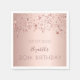 Une serviette en papier pour un cadre de table girly et glamour de 30e anniversaire. Un arrière - plan rose à l'aspect faux métallique et à l'or rose élégant brillant, étoiles qui dégoulinent. Le texte : Le nom est écrit en or rose foncé avec un script de style manuscrit moderne. Tempérer pour une date et l'âge 30.