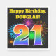 Ce design amusant et vibrant de serviette en papier présente un motif inspiré de feux d'artifice de célébration colorés, ainsi que le nombre "21" ayant un motif de dégradé multicolore semblable à un arc-en-ciel, sur un fond de couleur noire. Il comporte également un nom personnalisable et un message d'événement. Des serviettes en papier comme celle-ci pourraient peut-être être utilisées lors d'une fête organisée pour célébrer le vingt-et-unième anniversaire de quelqu'un. [~Z0000326]