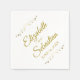 Ces belles serviettes feront de votre réception de mariage quelque chose de spécial. Elles présentent un design simple mais élégant avec du texte en or sur un arrière - plan blanc avec une bordure florale en faux feuille d'or. Personnalisez facilement avec vos noms et la date du mariage.