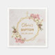 Cette élégante serviette en papier de baptême fleurie recommandée pour le baptême d'une fille a un cadre d'or géométrique irrégulier avec bouquets de fleurs d'orchidées blanches et roses vers le haut et le bas gauche sur deux hexagones d'or qui superposent, avec une croix d'or en haut. Le nom de l'enfant est écrit dans un élégant script calligraphique ; le reste est écrit en casquette plus petit. Tout le texte a une couleur jaune doré, comme le cadre doré. Le bouquet vintage de fleurs aux orchidées roses et blanches est tiré d'une carte postale vintage de Bertha Maguire (1862-1910), désormais dans le domaine public.