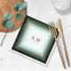 A watercolor background in shades of emerald green is topped by an abstract of fine gold lines and glittering lighting effects to create the pieces of this beautiful wedding suite. The wedding paper napkin shown here also features a gradient, gold-edged frame to hold the bride and groom's initials and wedding date. Search ID867 to see other pieces and color choices for this set.
