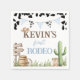 Adorable western-themed napkin for a baby’s first rodeo birthday party. Features cute cowboy elements, cactus, barrel, boots, and cow print accents in soft blue and neutral tones. Perfect for rodeo, western, farm, or cowboy birthday celebrations and dessert tables.