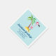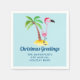 Serviettes en papier avec le texte : voeux de Noël (peut être modifié/édité). Dessin fantaisiste d'un flamant rose portant un chapeau de santa rouge. Posé sur un monticule de sable de plage jaune avec à l'arrière un cocotier vert et marron. Arrière - plan bleu clair. Design tropical sympa et festif.
