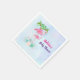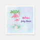 Serviettes en papier personnalisées pour un événement comme un baby shower. Conçu avec l'illustration d'une maman et d'un bébé flamant rose debout sur un lit de fleurs florales succulentes avec des palmiers verts se balançant dans le dos. Tropical et joli. L'arrière - plan est une aquarelle d'été bleu clair avec des touches de violet.