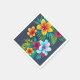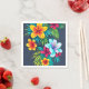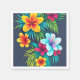 Des fleurs tropicales vibrantes dans les tons jaune, rouge et bleu sont entourées de feuilles verdoyants contre un arrière - plan foncé. L'agencement coloré crée une atmosphère animée et exotique.