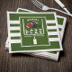 Serviettes de bachelor à thème football américain vert et blanc avec rayures, but de terrain, casque et balle. Personnalisez-le avec le nom du marié.
