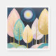 Un tableau éthérée et symbolique représentant une scène forestière stylisée et abstraite. De grands arbres en forme de larme aux branches épineuses dominent la partie supérieure de la toile, dont les toiles sont habillées de douces nuances de rose, de turquoise et d'or, dont certaines présentent des détails chatoyants sur les feuilles d'or. Un corps céleste, un grand orbe aux anneaux concentriques de bleu, de violet et de jaune, est suspendu dans le ciel bleu profond. Au premier plan, un paysage vallonné de collines arrondies dans différents pastels, traversé par un chemin sinueux aux couleurs arc-en-ciel. L'impression générale est celle d'un paysage onirique, mystique, rempli de couleurs vives et de formes géométriques.