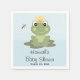 Ajoutez votre nom et votre date d'événement à l'adorable bleu, vert, jaune et gris de cette mignonne serviette en papier baby shower à thème de prince grenouille avec une froggie kawaii mignonne portant une couronne dorée tout en étant assis sur un tapis de nénuphars contre un pois bleu ciel. Une libellule vole à côté de lui. Oeuvre © Chrissy H. Studios, LLC. Tous droits réservés.