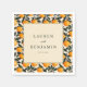 Ces serviettes de mariage présentent un design vibrant et joyeux avec un motif répétitif d'oranges stylisées et de feuilles vert foncé entourant un panneau beige central. La disposition est équilibrée et symétrique, créant un cadre accueillant pour la typographie élégante à empattements qui met en valeur les noms et la date en lettres majuscules. Le thème ludique des agrumes transmet la fraîcheur et la vitalité, faisant de ces serviettes un élément parfait pour ajouter une touche animée à votre célébration. Idéal pour les mariages ou les occasions spéciales, ce design combine des éléments graphiques modernes avec une ambiance chaleureuse et festive.