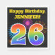 Ce design amusant et vibrant de serviette en papier présente un motif coloré inspiré par les feux d'artifice célébré, ainsi que le numéro "26" avec un arc-en-ciel multicolore comme un motif dégradé, sur un arrière - plan de couleur noire. Il comporte également un nom et un message d'événement personnalisés. Des serviettes en papier comme celle-ci pourraient être utilisées lors d’une fête d’anniversaire pour célébrer le vingt-sixième anniversaire de quelqu’un. [~Z0000326]