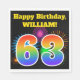 Ce design amusant et dynamique de serviette en papier présente un motif coloré inspiré par les feux d'artifice célèbres, ainsi que le numéro "63" avec un motif multicolore en dégradé d'inspiration arc-en-ciel, sur un arrière - plan de couleur noire. Il comporte également un nom et un message d'événement personnalisés. Des serviettes en papier comme celle-ci pourraient peut-être être utilisées lors d’une fête organisée pour célébrer le soixante-troisième anniversaire de quelqu’un. [~Z0000326]