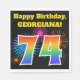 Ce design amusant et dynamique de serviette en papier présente un motif coloré inspiré par des feux d'artifice célèbres, ainsi que le numéro "74" avec un motif dégradé multicolore inspiré de l'arc-en-ciel, sur un arrière - plan de couleur noire. Il comporte également un nom et un message d'événement personnalisables. Des serviettes en papier comme celle-ci pourraient être utilisées lors d’une fête d’anniversaire pour célébrer le soixante-quatorzième anniversaire de quelqu’un. [~Z0000326]