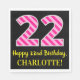 Ce design amusant sur le thème de l'anniversaire de la serviette en papier dispose d'un grand numéro "22", avec un motif de rayures rose clair et rose foncé. Il comporte également le message "Joyeux 22e anniversaire", et un nom personnalisé. L'arrière - plan est noir de couleur. Des serviettes en papier customisées et amusantes comme celle-ci pourraient être utilisées lors d’une fête d’anniversaire pour célébrer le vingt-deuxième anniversaire de quelqu’un. [~Z0000380]