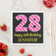 Cette conception amusante de serviette en papier sur le thème de l'anniversaire comporte un grand numéro "28" avec un motif rose foncé et rose clair rayures, avec le message "Joyeux 28e anniversaire", et un nom personnalisé. L'arrière - plan est noir de couleur. Des serviettes en papier comme celle-ci, amusantes et modifiables, pourraient être utilisées lors d’une célébration d’anniversaire en l’honneur du 28e anniversaire de quelqu’un. [~Z0000380]