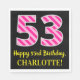 Ce design amusant sur le thème de l'anniversaire de papier serviette dispose d'un grand nombre de "53", avec un motif de rayures rose clair et rose foncé. Il comporte également le message "Joyeux 53e anniversaire", et un nom personnalisable. L'arrière - plan est noir de couleur. Des serviettes en papier personnalisées et amusantes comme celle-ci pourraient être utilisées lors d’une fête d’anniversaire qui se tient en l’honneur du 53e anniversaire de quelqu’un. [~Z0000380]