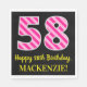 Ce design amusant sur le thème de l'anniversaire de la serviette en papier dispose d'un grand numéro "58", avec un motif de rayures rose foncé et rose clair. Il comporte également le message "Joyeux 58ème anniversaire", et un nom personnalisable. L'arrière - plan est noir de couleur. Des serviettes en papier customisées et amusantes comme celle-ci pourraient être utilisées lors d’une fête d’anniversaire pour célébrer le cinquantenaire de quelqu’un. [~Z0000380]