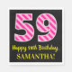 Cette conception amusante de serviette en papier sur le thème de l'anniversaire comporte un grand nombre de "59" avec un motif rose foncé et rose clair rayures, ainsi que le message "Happy 59th Birthday,", et un nom personnalisé. L'arrière - plan est noir de couleur. Des serviettes en papier customisées et amusantes comme celle-ci pourraient être utilisées lors d’une fête organisée pour célébrer le 59e anniversaire de quelqu’un. [~Z0000380]