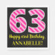 Cette conception amusante de serviette en papier sur le thème de l'anniversaire comporte un grand nombre de "63" avec un motif rose clair et rose foncé rayures, avec le message "Happy 63rd Birthday,", et un nom personnalisable. L'arrière - plan est noir de couleur. Des serviettes en papier sur le thème de l’anniversaire comme celle-ci pourraient être utilisées lors d’une fête célébrant le soixante-troisième anniversaire de quelqu’un. [~Z0000380]