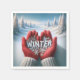 Flammes de neige sur gants rouges sur une scène boisée d'hiver avec texte HIVER.