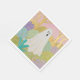 A whimsical and surreal painting featuring a classic, cartoon-like ghost figure—a white sheet with black holes for eyes and an open mouth—centered in a lush, stylized garden or forest setting. The background is dominated by gold leaf and broad, expressive strokes of light pink and gold suggesting trees. The foreground is a dense array of abstract foliage and bushes painted in thick, vibrant colors including lavender, bright green, teal, and blue. The overall aesthetic is naive, dreamlike, and uses a striking combination of flat, folk-art elements and rich, textural embellishment.
