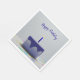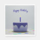 Un gâteau d'anniversaire en caricature bleue avec un glaçage couvert d'arrosage qui coule sur les côtés et une bougie éclairée est posée sur une plaque dorée sur un comptoir couvert de points colorés.